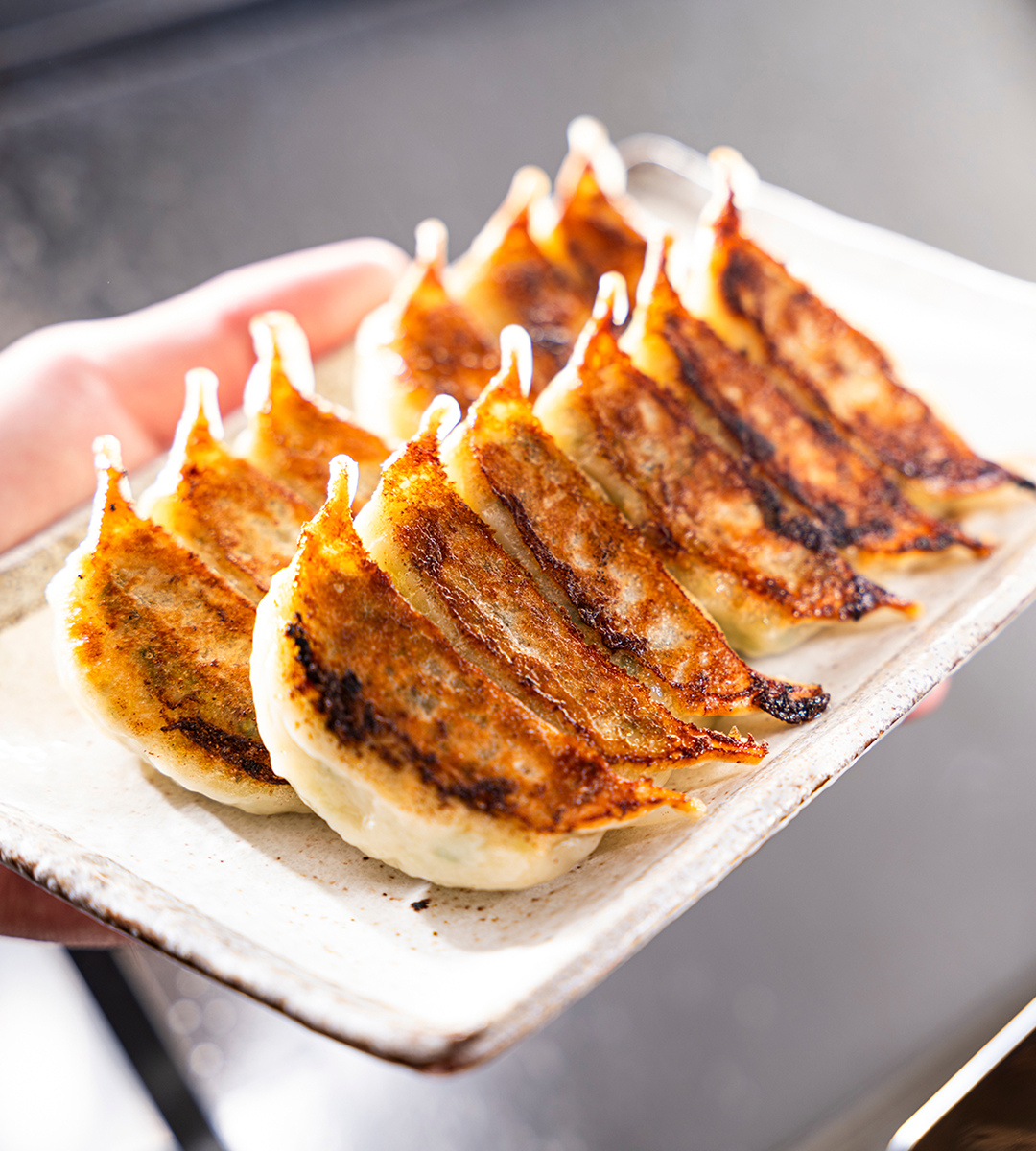 最終的に行きついたのは京都という土地柄を考え、「芸子さんや舞妓さんに愛される。」をテーマに加えた配合でした。お召し物を汚さぬよう、タレを点けずとも美味しい。一口でも頬張れるサイズ感。野菜中心でヘルシー。ニンニク臭が気にならない。等ですが、これは同時に女性ファンも増やせる。餃子と言えば仕事終わりにビールでかきこむ男性的なイメージが強いと感じておりましたが、この配合であればファン層を広げられるのではと考えました。エッジの効いたタレを点ける事で様々なアルコール飲料との相性も向上するはず。